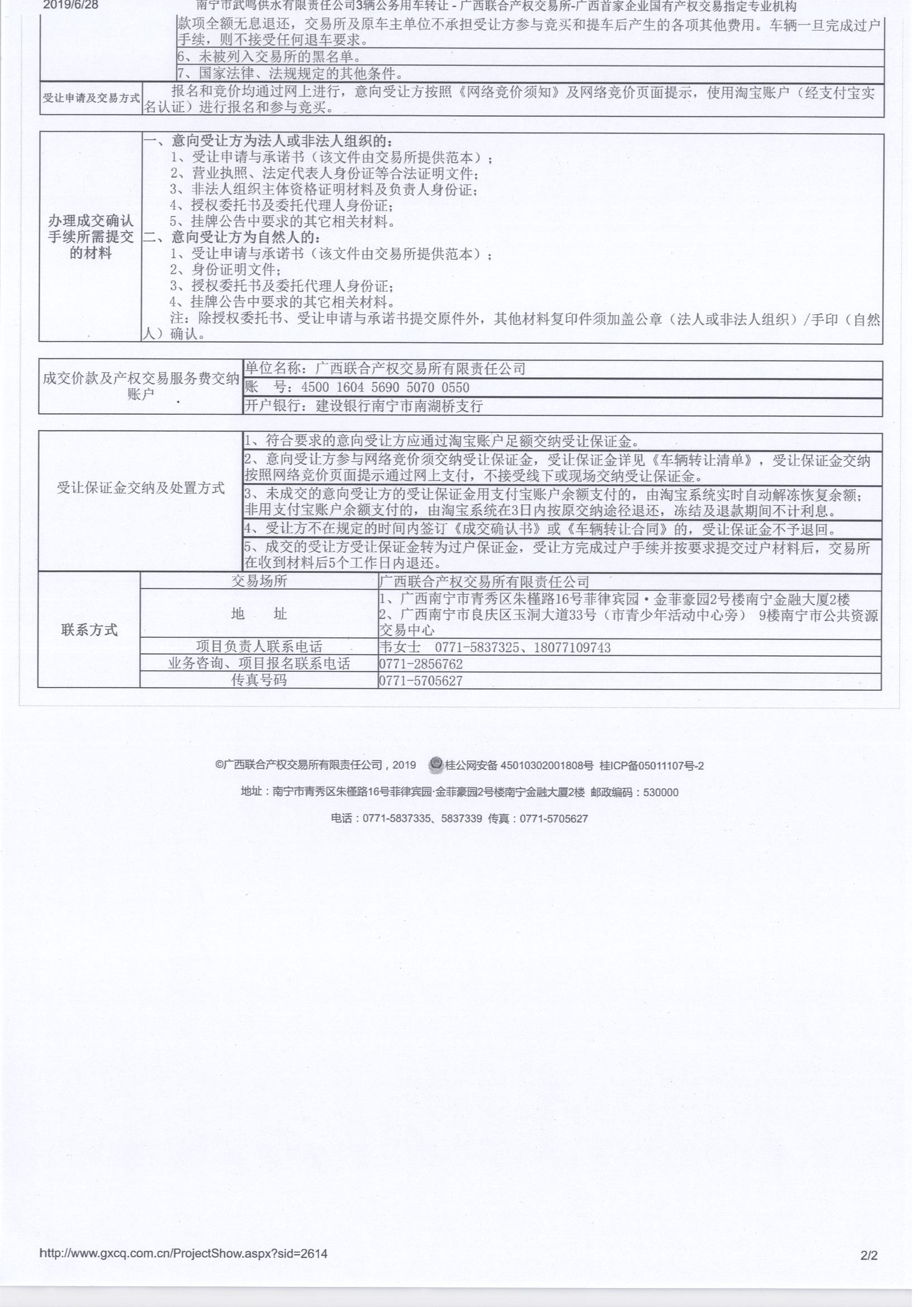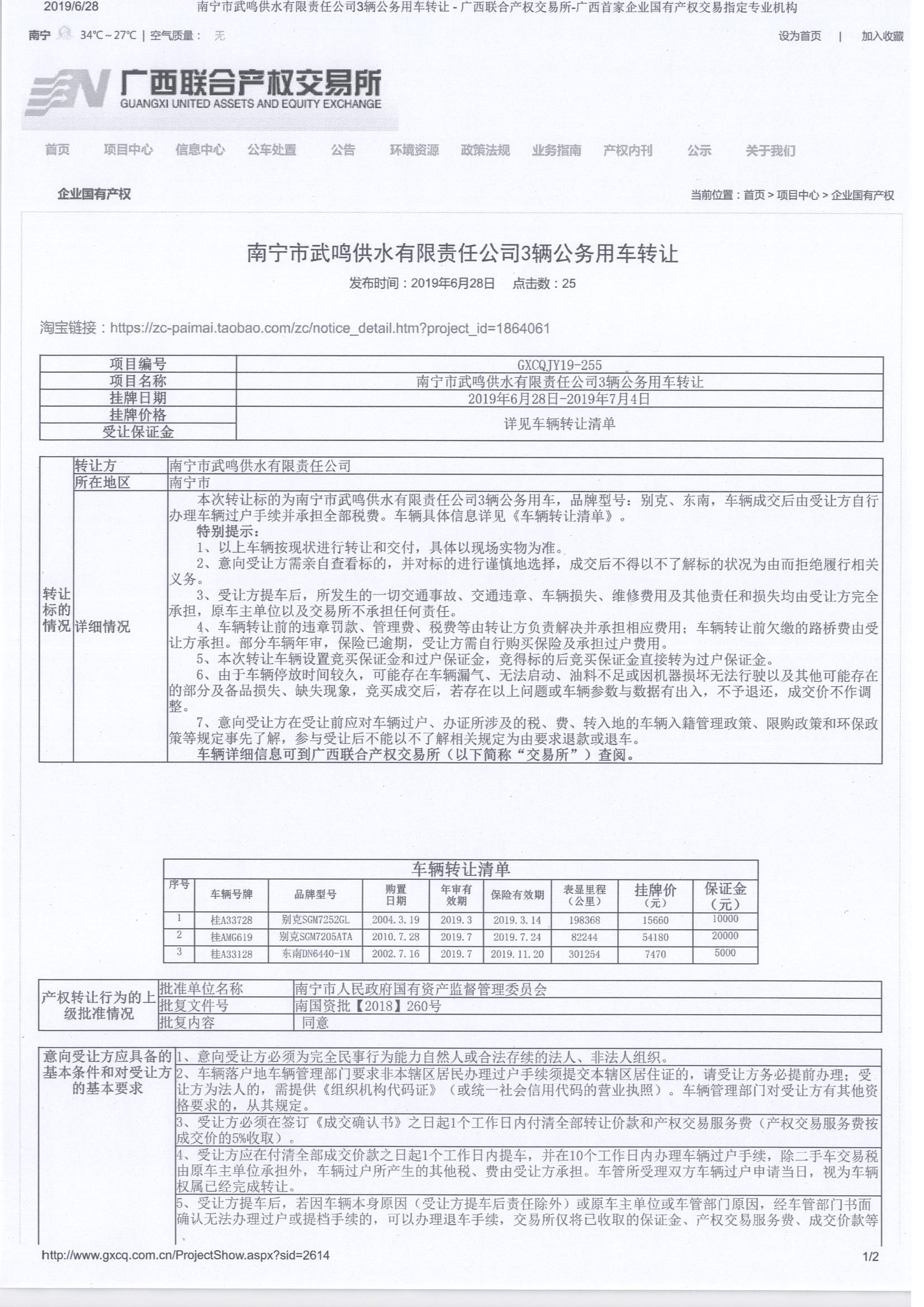 广西联合产权交易所有限责任公司已于2019年6月28日分别在南国早报及广西联合产权交易所有限责任公司自有的网络竞价平台、淘宝平台进行了公告,挂牌公告期为7日(2019年6月28日到2019年7月4日),具体详情请点击该链接了解:http://www.gxcq.com.cn/ProjectShow.aspx?sid=2614