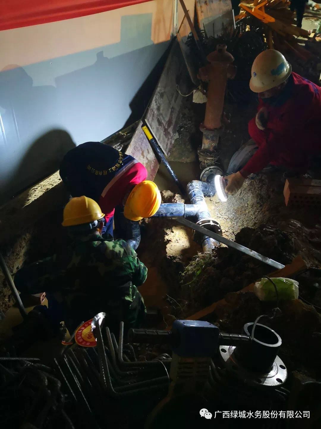 (图为施工人员挑灯夜战开展内线供水管道安装)