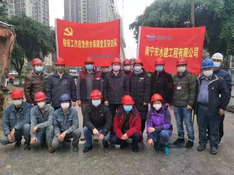 面对疫情时期特殊的建设施工任务,绿城水务党委下属南宁市水建工程有限公司(以下简称“水建公司”)党支部根据疫情防控工作部署,立即号召公司广大党员积极发挥党员先锋模范作用,展现担当,挺身而出,冲锋在前,于1月30日火速成立了防疫工作应急供水保障党员突击队,全力以赴做好保障疫情防控期间的供水保障施工建设任务。
