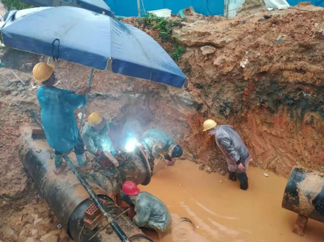 ▲水建公司供水保障突击队在福建路凌铁水厂DN1200原水管改管工地调试安装管件位置,
