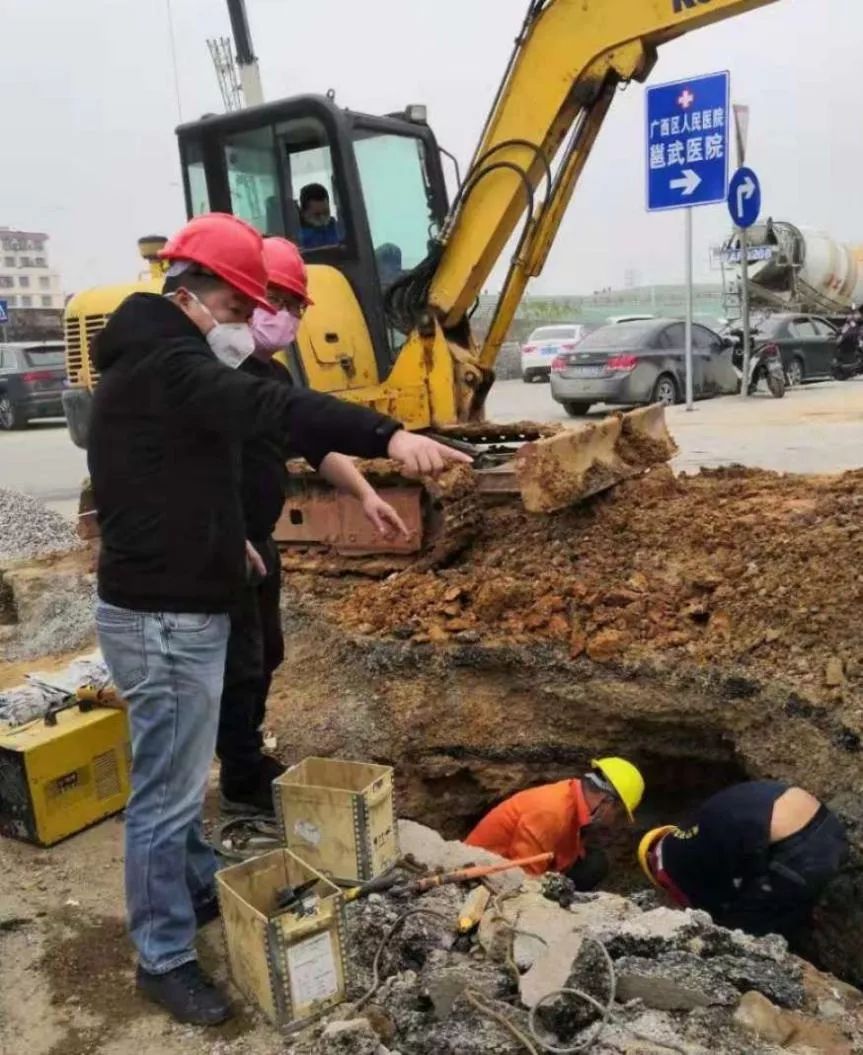 尽管施工过程困难重重,道路开挖遇到地下管线密布且复杂,涉及多方交叉施工作业,市政管路无法按原来设计的图纸路由在短期内完成,还得解决不影响道路通行、不影响医院院区正常用水等问题,应急供水保障党员突击队成员们集思广益,一再调整、优化施工方案,采取“带水作业”的施工方式,团结协作,日夜兼程,功夫不负有心人,经过应急供水保障党员突击队努力,水建公司火速用2天完成邕武医院供水报装工程,4天完成邕武路360米市政供水管道施工,于2月4日晚上12点进行新旧管连接,经冲洗后即投入使用,满足了邕武医院新扩建院区的用水需求,为确保新院区如期交付使用奠定坚实基础。