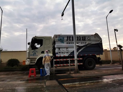 ▲三塘中转站防控人员为站内生活垃圾转运车辆消毒。