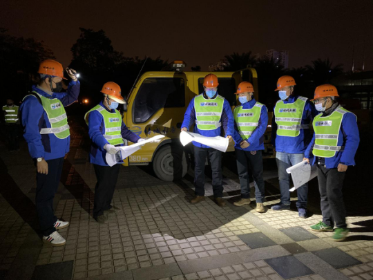 图为在疫情防控期间,绿城水务公司一线党员职工现场研究讨论管网降水排查工作。