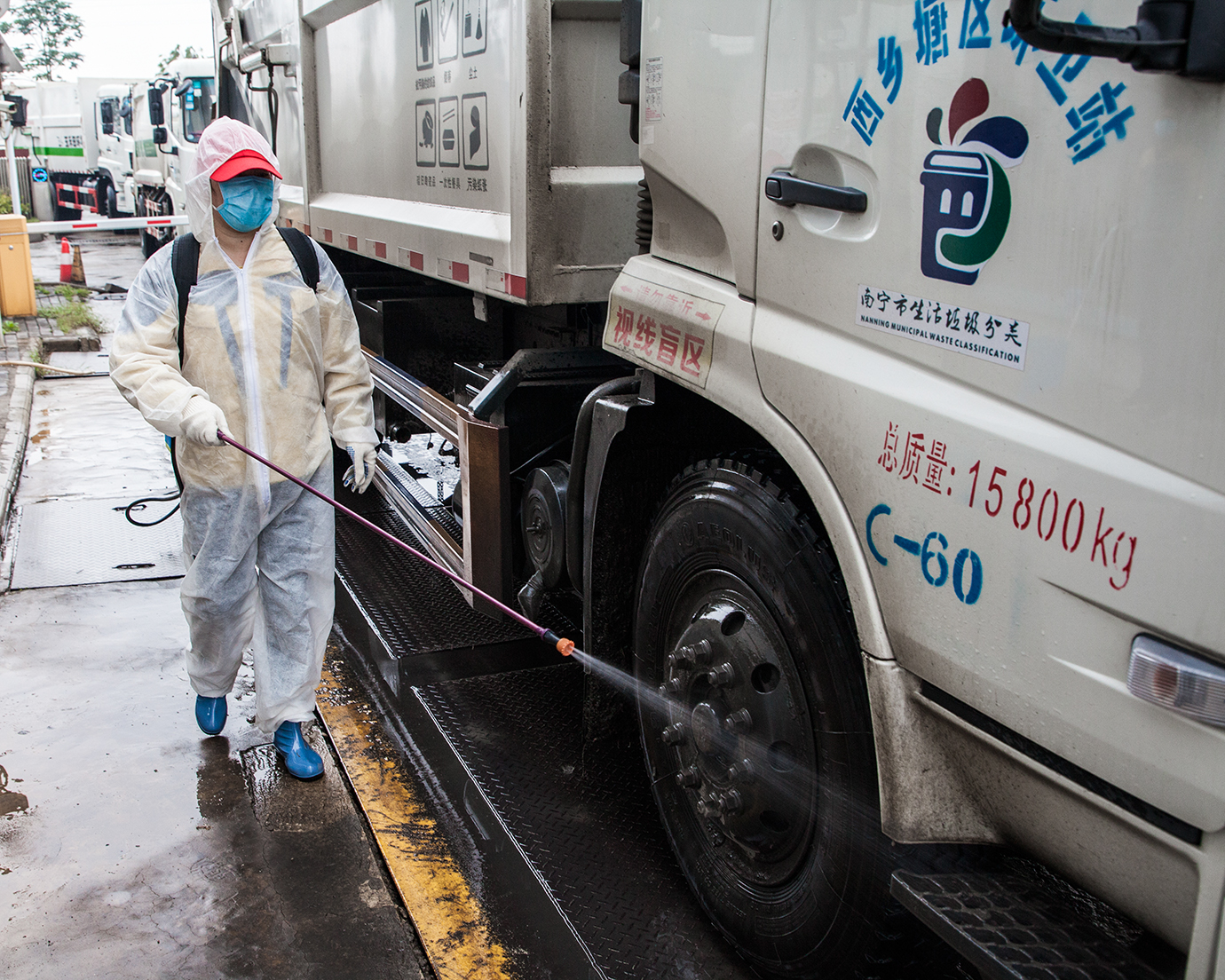 疫情期间,南宁市三塘生活垃圾中转站每天接收5个城区垃圾大约1800吨左右,经过压缩处理后,最终转运至焚烧发电厂进行减量化、无害化处置。图为工作人员逐一给排着长龙即将进站的垃圾车辆消毒。(集团总经办 陈贵贤 摄)