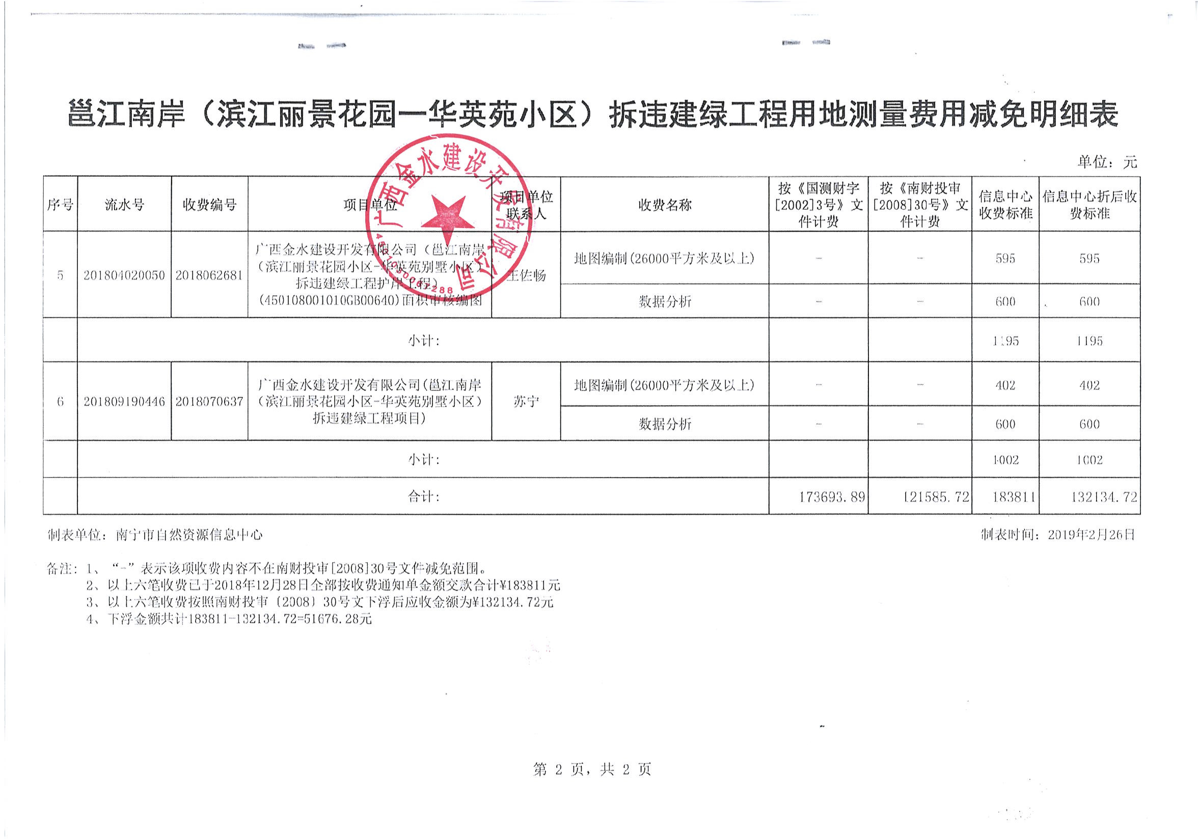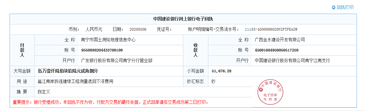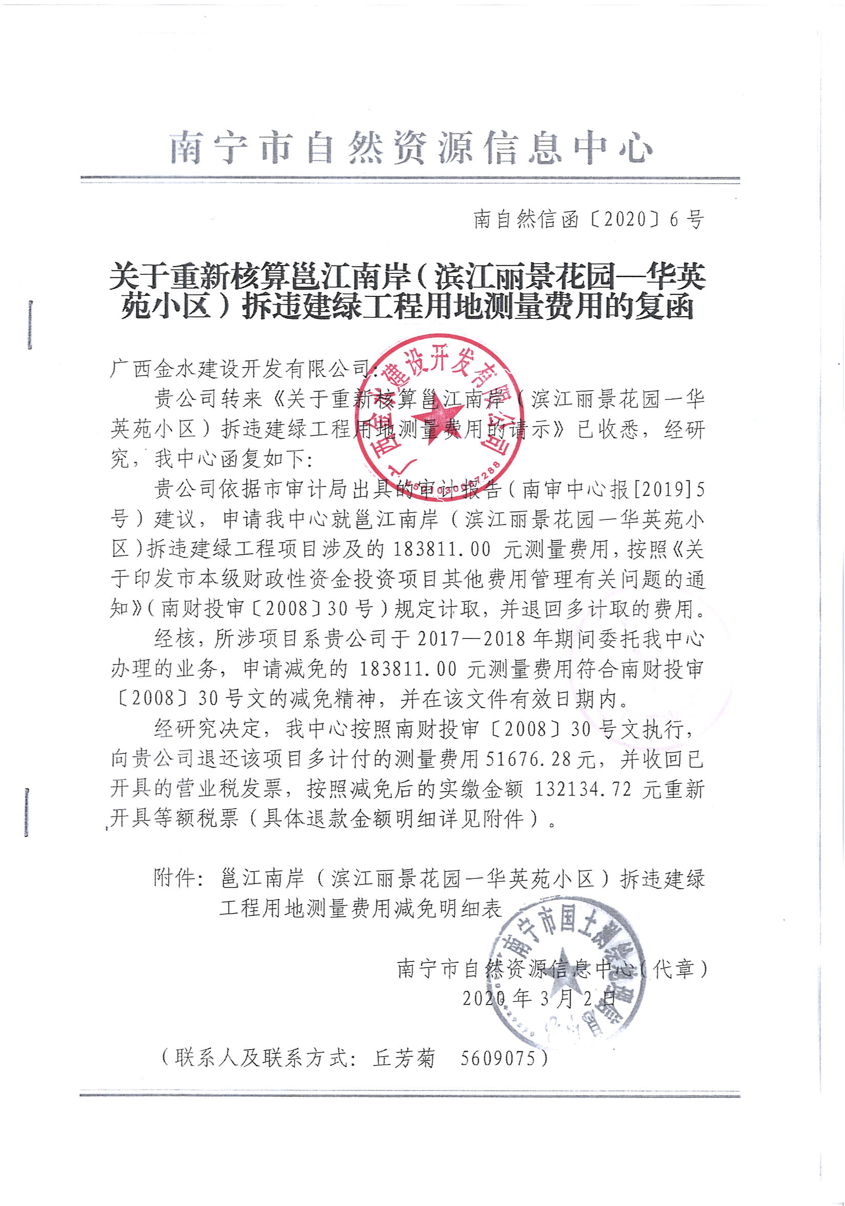 南宁市自然资源信息中心已按南财投审﹝2008﹞30号文件精神,将邕江项目南岸(丽景花园-华英苑)拆违建绿工程未按规定收取的用地测量等费用51676.28元退回我公司。