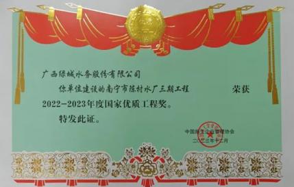 陈村水厂三期工程喜获中国施工企业管理协会优质工程奖